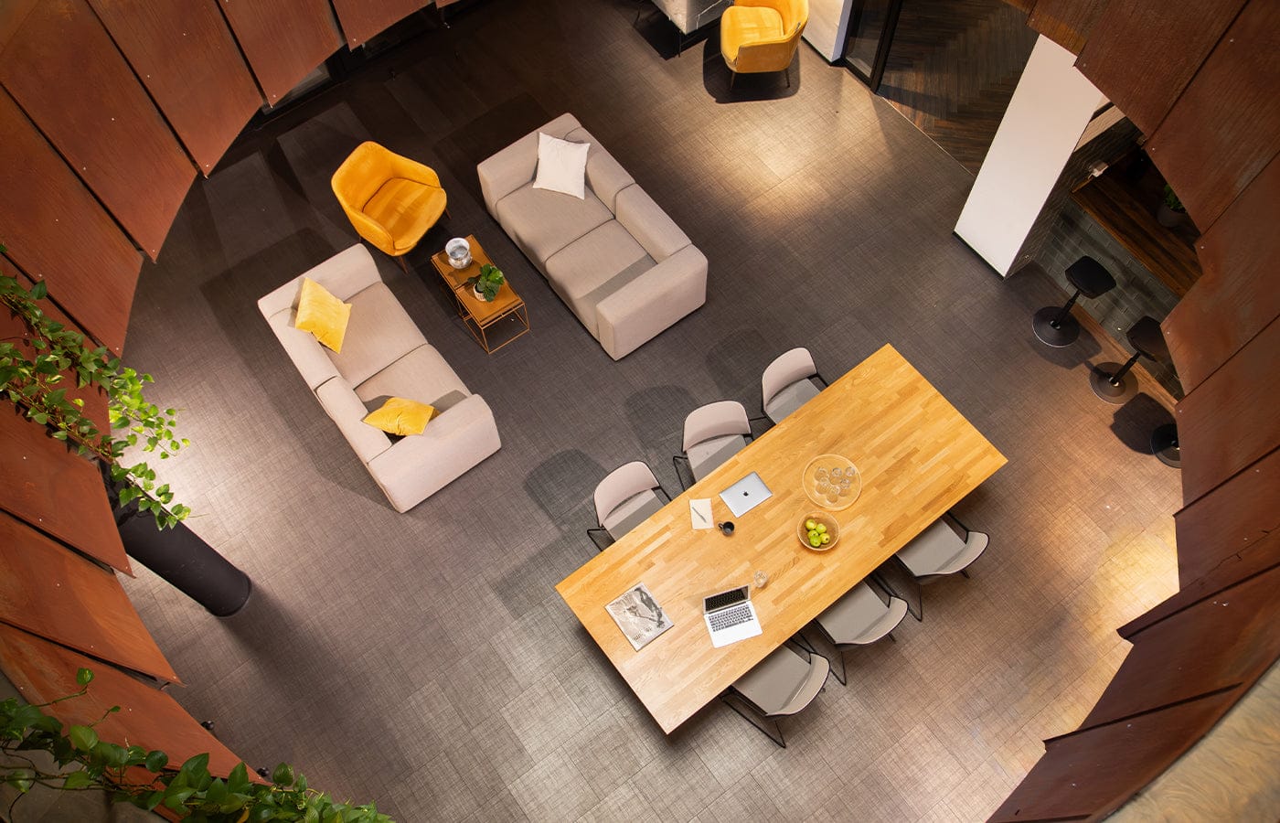 Neben mehreren geschlossenen Besprechungsräumen bietet der erste Stock einen weiteren offenen Konferenztisch, der Raum für lockeren Austausch und kreative Zusammenarbeit schafft. Der Aeris Linu mit 4-Strahl-Kreuz sorgt dabei für eine stilvolle Optik. Dank seiner Flex-Kinematik ermöglicht er natürliche Bewegungen nach vorne, hinten und zur Seite und eignet sich damit ideal für dynamische Arbeits- und Konferenzsituationen.