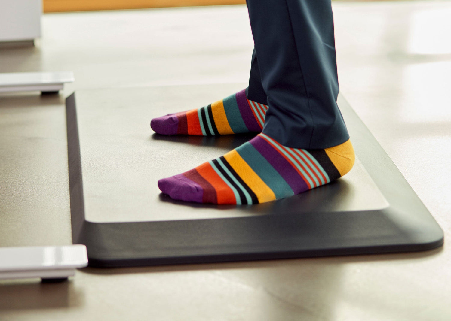 Das Stehen auf harten Böden bedeutet für deinen Körper schon nach kurzer Zeit Schwerstarbeit. Um das Arbeiten im Stehen für dich angenehmer zu machen, haben wir die Aeris Muvmat entwickelt. Diese spezielle Anti-Ermüdungsmatte ist die perfekte Ergänzung zu deinem höhenverstellbaren Schreibtisch, aber auch für alle anderen Arbeitsplätze, an denen man lange stehen muss. Die topografische 3D-Struktur in der Stehmatte aktiviert die Fußreflexzonen, entspannt die Muskeln und hält den Körper in Bewegung: wie bei einem Spaziergang auf Waldboden.